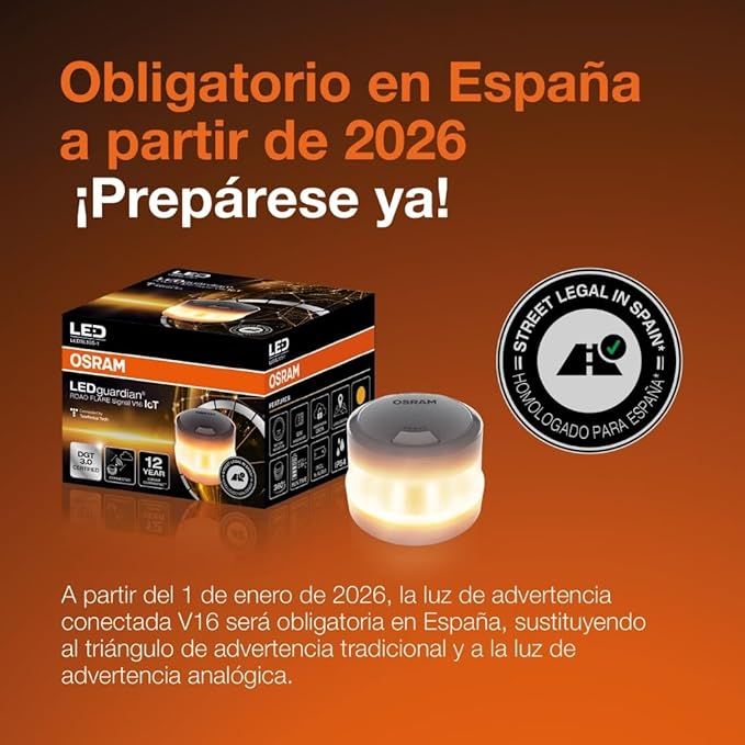 LEDguardian ROAD FLARE Signal V16 IoT es la nueva luz de emergencia certificada y homologada, preparada para la red 3.0 de la DGT en España. Será obligatoria a partir del 1 de enero de 2026, reemplazando a los actuales triángulos de emergencia¹.