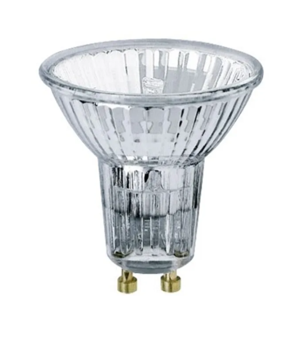 Bombilla halogena regulable directa a red con reflector dicroico y casquillo GZ10 Gu10. El reflector dicroico hace que el calor se filtre en la direccion del reflector y emita menos calor en la direccion de haz de luz. La normativa obliga a que estas bombillas, con reflector dicroico, sean de Casquillo GZ10. La bombilla no es compatible con casquillos GU10